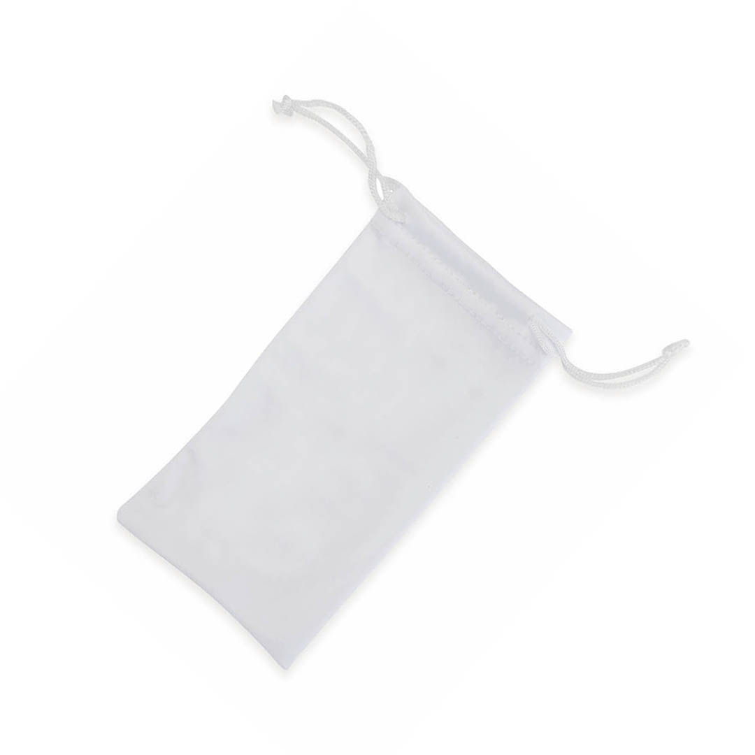 Bolsa de poliéster macio com corpo acabado branco e fechamento de cordas de cor correspondente. Especialmente projetado para impressão de sublimação.