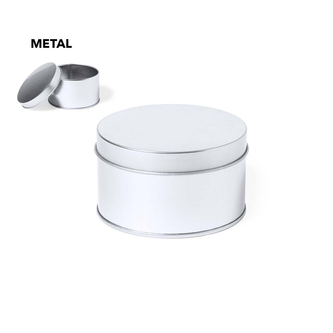 Estojo de apresentação de formato redondo, fabricada em resistente metal de acabamento prateado e com tampa a condizer.