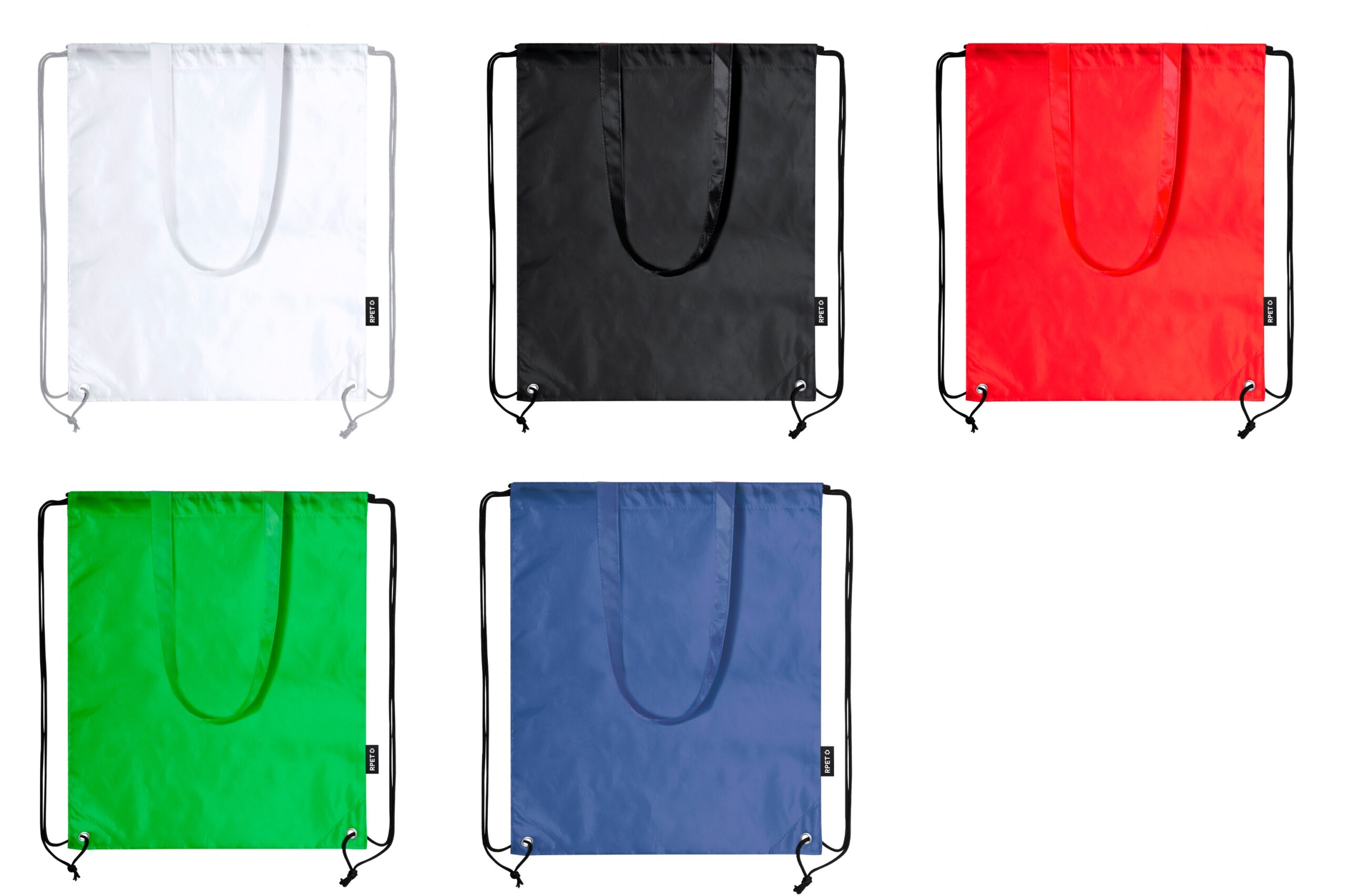 Saco mochila com cordões em resistente RPET 210T, com asas de transporte de 70 cm a condizer. Os cordões contam com argolas metálicas reforçadas e logotipo RPET reciclado na etiqueta lateral. Disponível numa variada gama de cores.O material RPET é fabricado a partir de plástico reciclado para promover a reutilização de resíduos de plástico e ajudar à sustentabilidade do planeta.