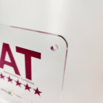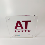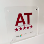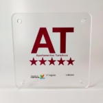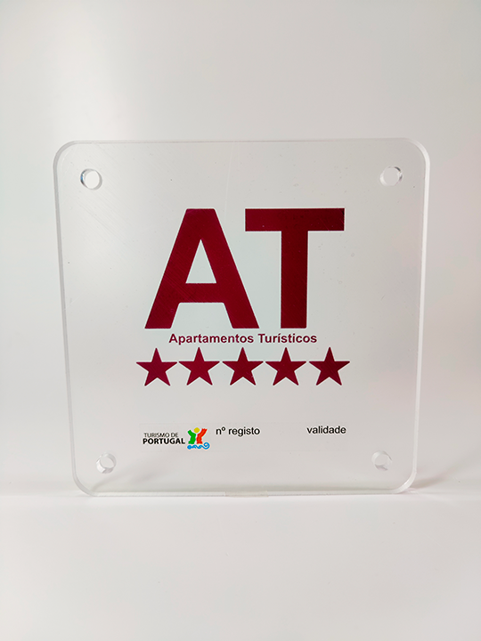 Placa identificativa Apartamentos Turísticos “5 Estrelas” de material acrílico cristal transparente, com 8mm de espessura, com as seguintes características: