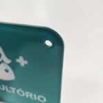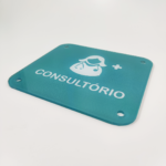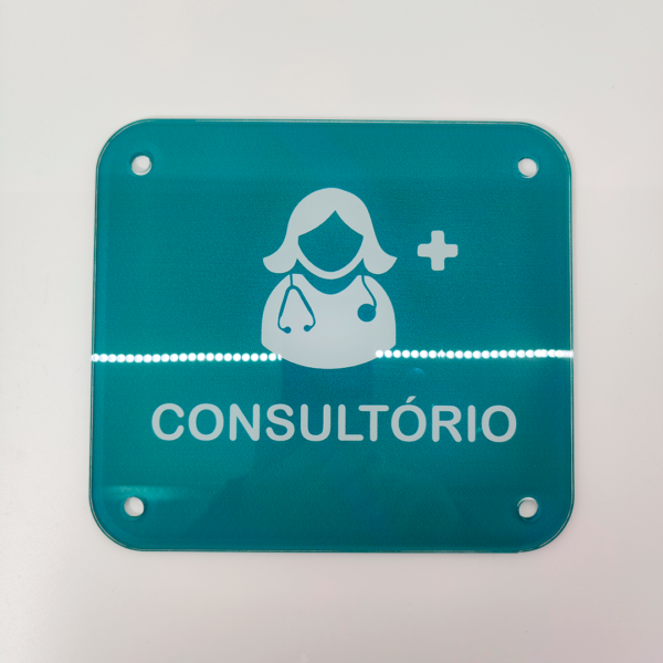 Placa identificativa “Consultório” de material acrílico cristal transparente, com 4mm de espessura e cantos redondos, com as seguintes características: