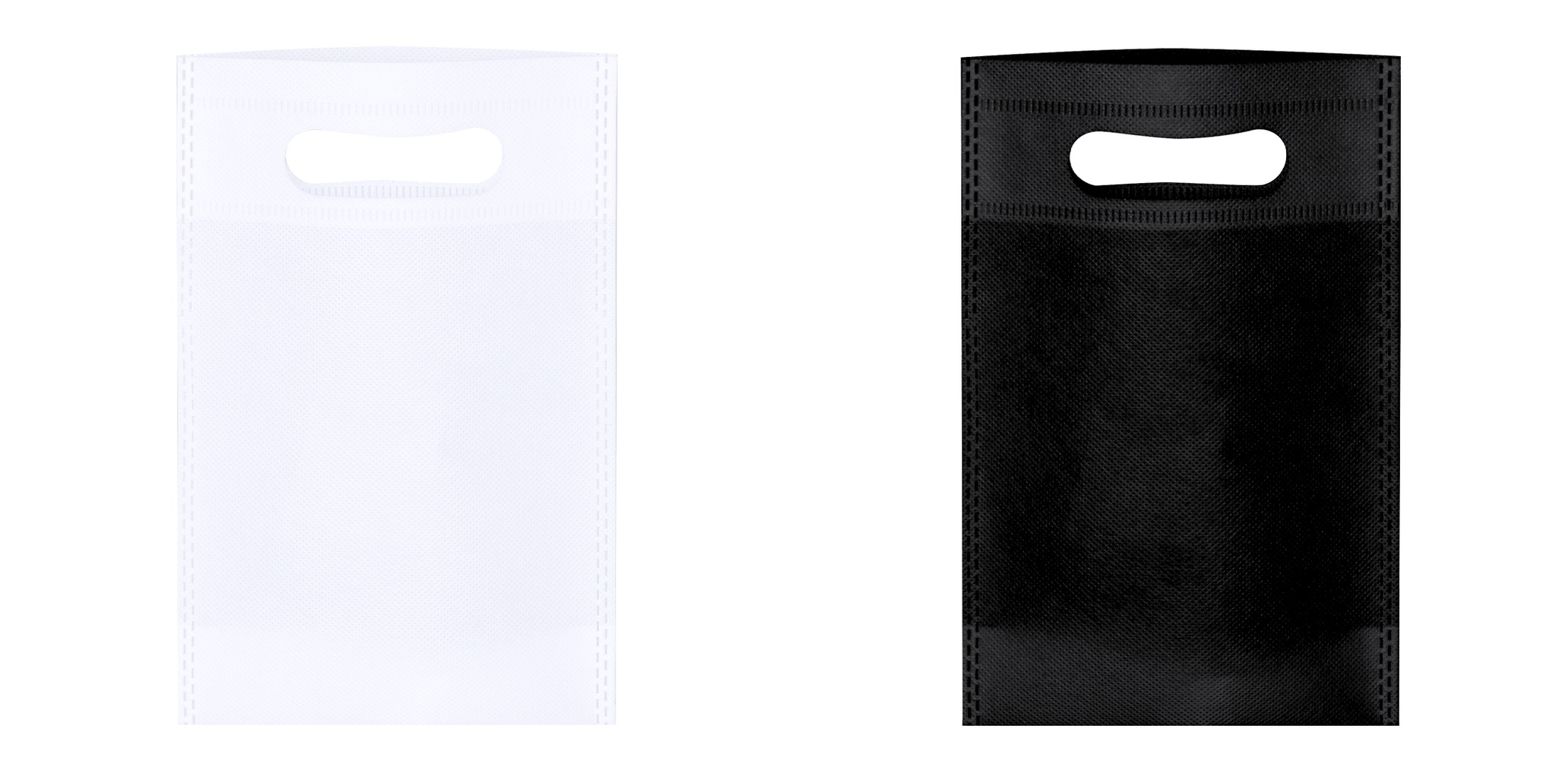 Non-Woven 80g/m2 bolsa. Com alça de acabamento selada a calor e fundo redondo.