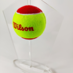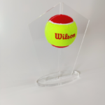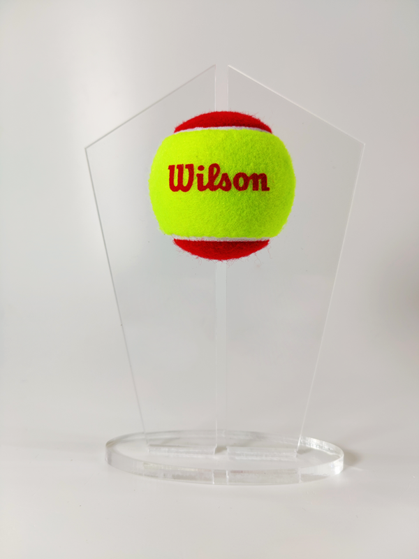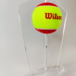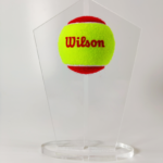 Troféu em acrílico cristal transparente com entrada para bola de ténis, personalizável em gravação laser