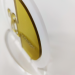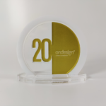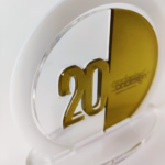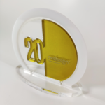 Troféu em acrílico cristal transparente com laminação dourada por trás e acrílico branco, personalizável em gravação laser